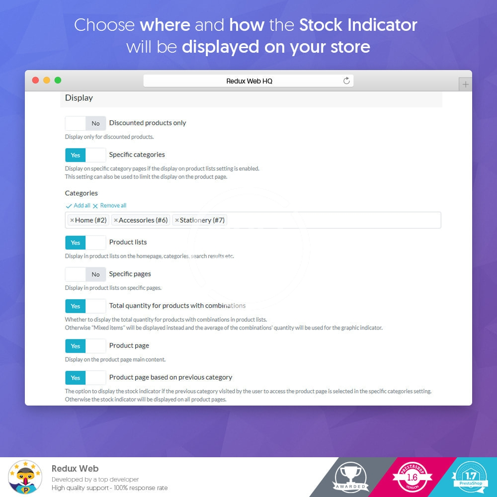 - Display the stock indicator if the previous category visited by the user to access the product page is selected in the specific categories setting. Otherwise the stock indicator will be displayed on all product pages.