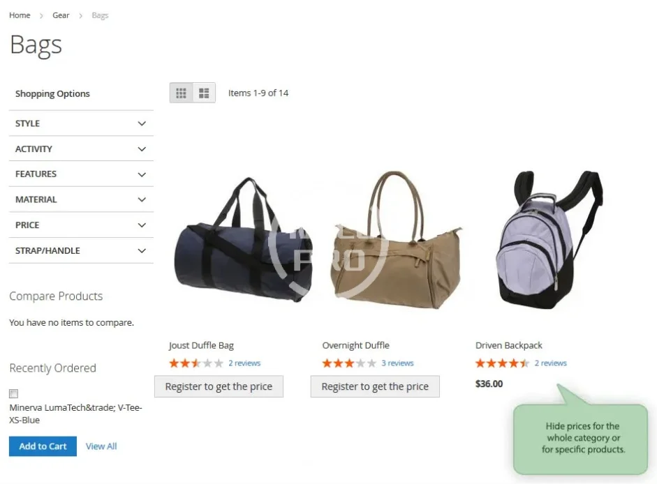 Hide product prices and "Add to cart" button for specific products or whole categories. Manage prices display depending on customer groups. Customize button texts and messages to make your pricing policy maximally flexible.