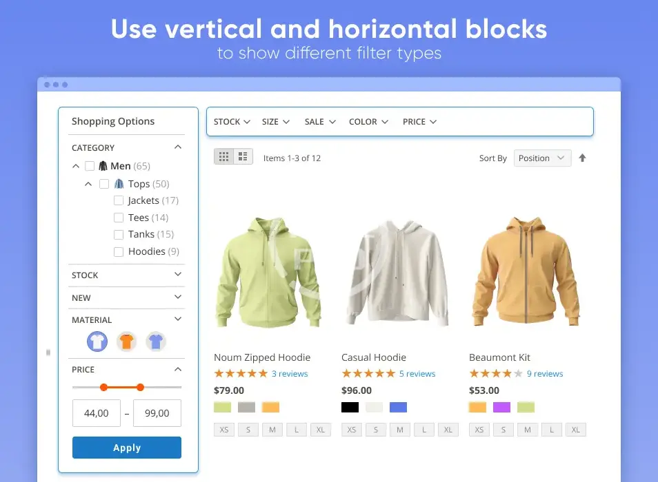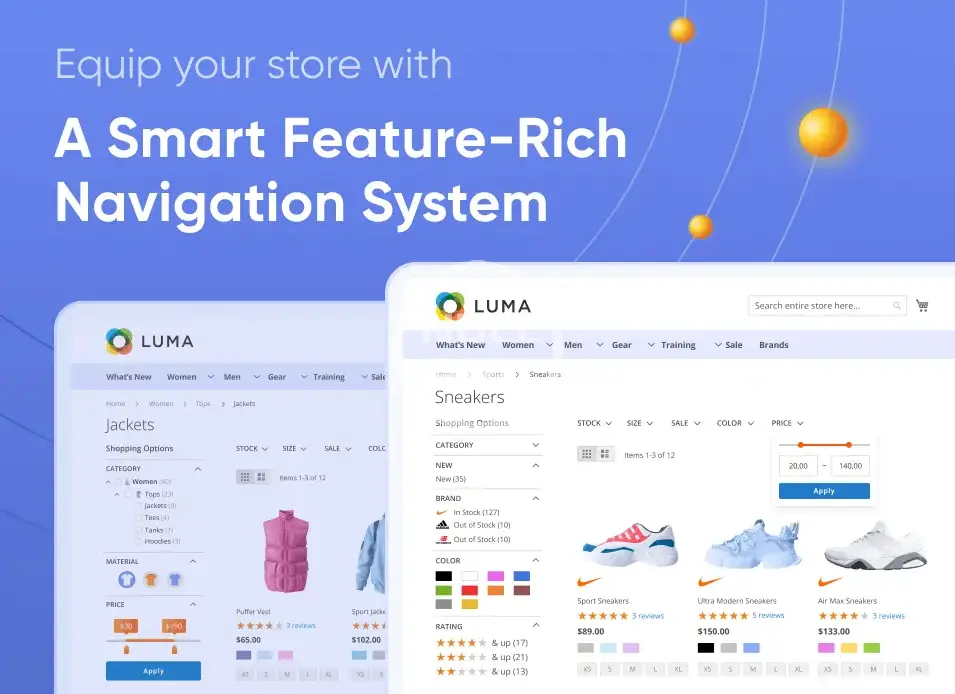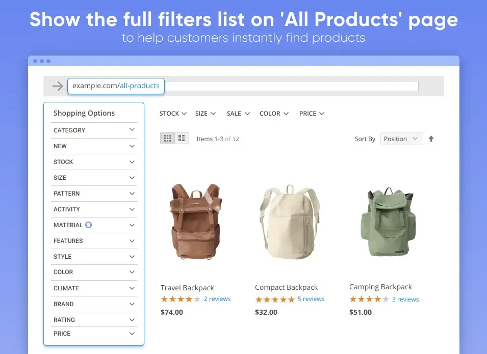 Build the ultimate customer shopping experience and boost your store SEO rankings with a feature-rich navigation system. Display multiple filters and handy widgets to help visitors instantly find the products they need.