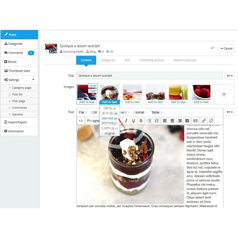 Editing content is a breeze - you can format text as you like, add images, videos, tables, or any other elements to blog posts. Uploading images is quick and easy, and they are automatically resized to predefined dimensions. Custom CSS/JS can be modified directly on the module configuration page, without needing to edit any files.