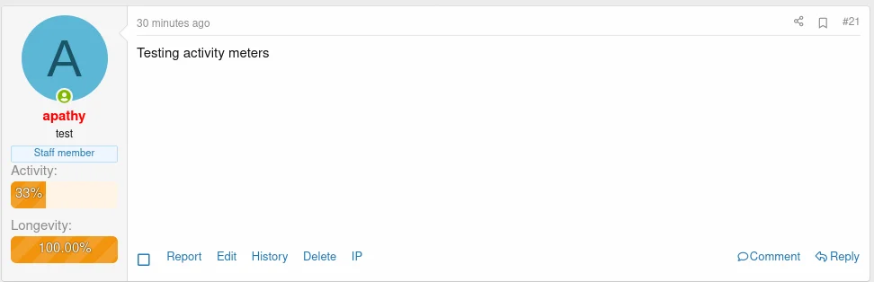 - This addon adds an "activity" and a "longevity" meter to users postbits and profiles.