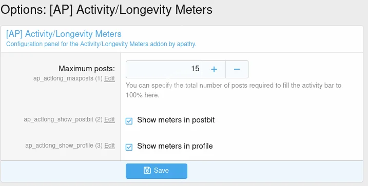 Admins can control how many posts are required to fill the activity bar to 100%, the color of the meters, and can disable them from appearing in postbits or profiles.