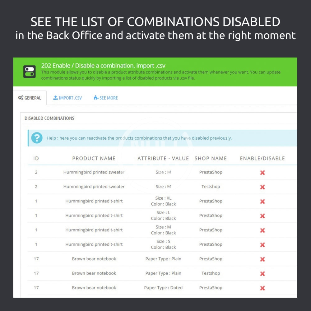 - With the "Enable / Disable a Combination, Import .csv" Module, you can simply choose to disable a variation by clicking on the "disable" icon (via the product page, the list of existing declinations)