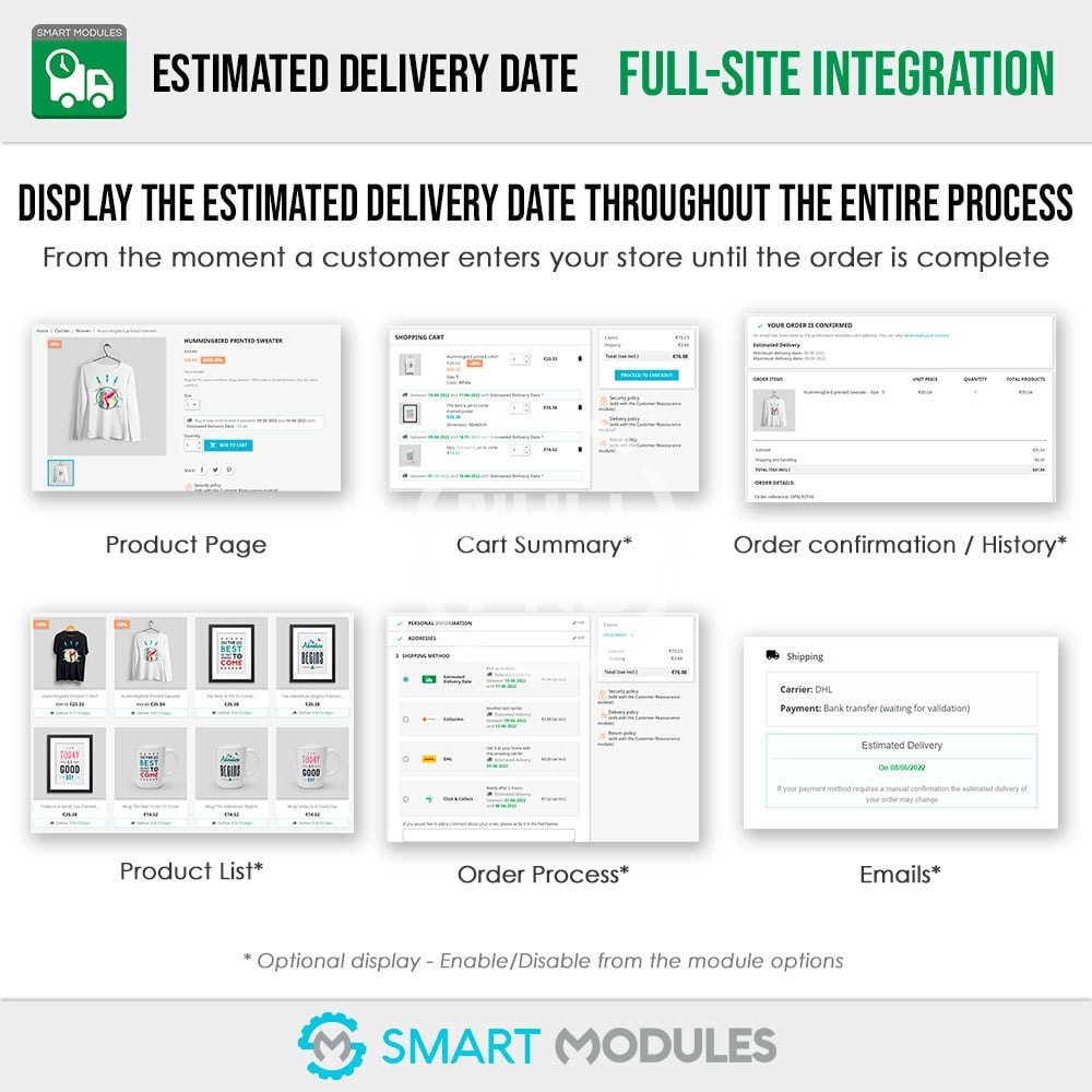 A must-have module for any shop. Increase customer trust and sales while reducing date-related support requests. Show your customers the estimated delivery date, from basic to elaborate configurations, on the product page, order process, and emails.