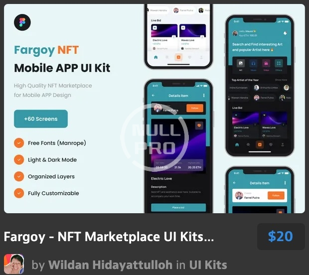 Fargoy NFT Marketlplace UI kit is compatible and works smoothly with Figma with well layered and organized, responsive resize, global color and text styles, and with free fonts family from Google Fonts (Manrope).