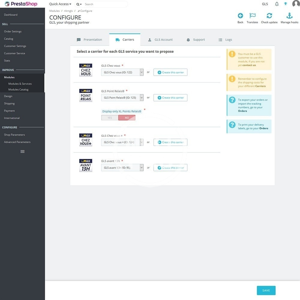 - Ability to generate shipping labels directly from PrestaShop through the GLS webservice