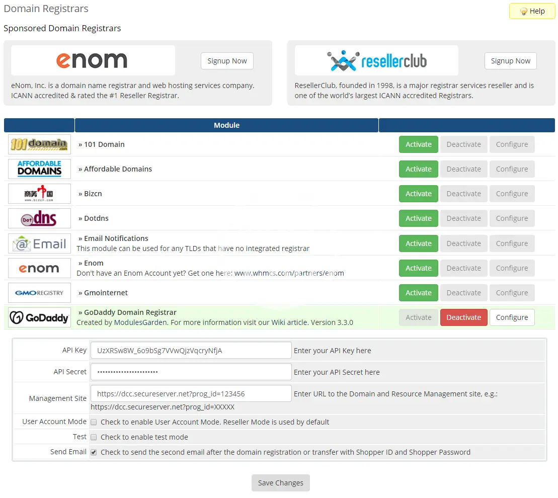 ModulesGarden GoDaddy Domain Registrar For WHMCS is a module created specially for GoDaddy API Resellers to enable you to automate the provisioning and management of domains in your WHMCS system. With its help you will be able to set up your TLDs & gTLDs with just a few clicks to start reselling them to your clients straight away!
