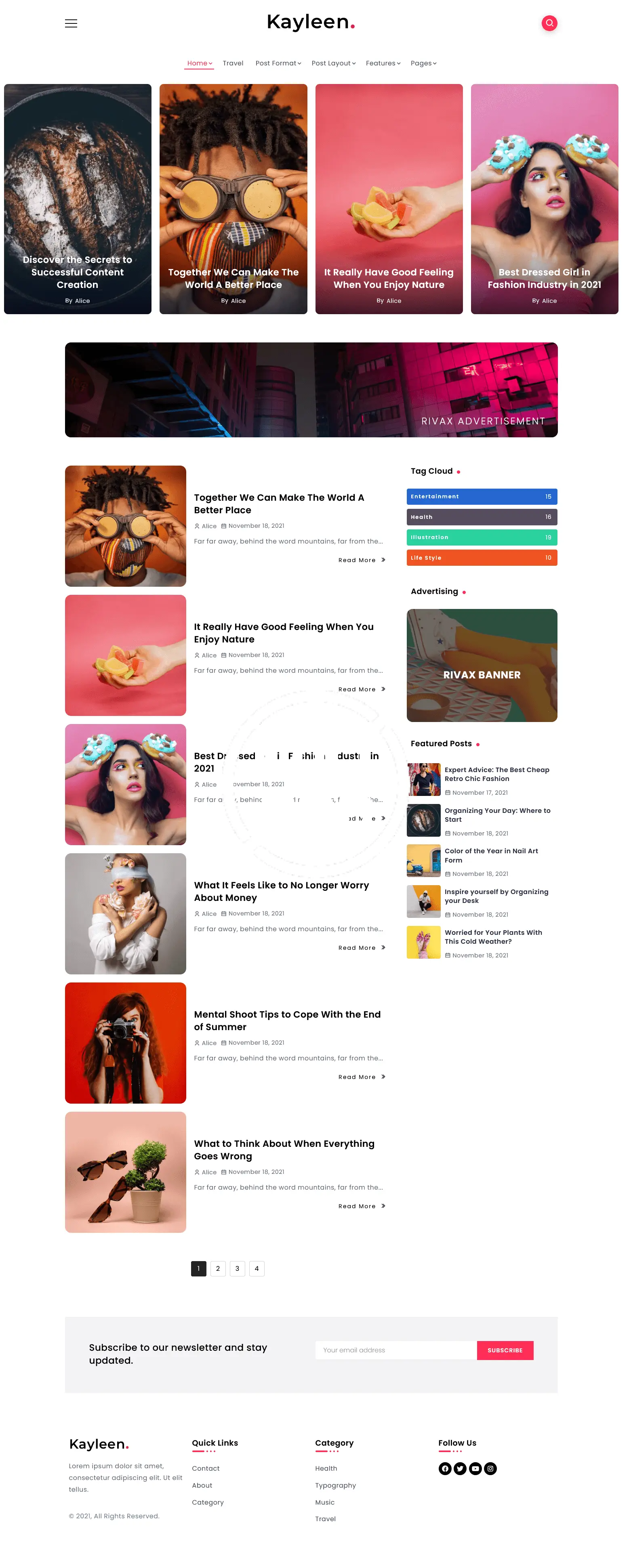 Kayleen is a Minimal, Clean, Creative and Multipurpose Wordpress theme focused on content and usability and is suitable for all kind of blog and magazine sites like personal blog, photography, travel, food, etc.