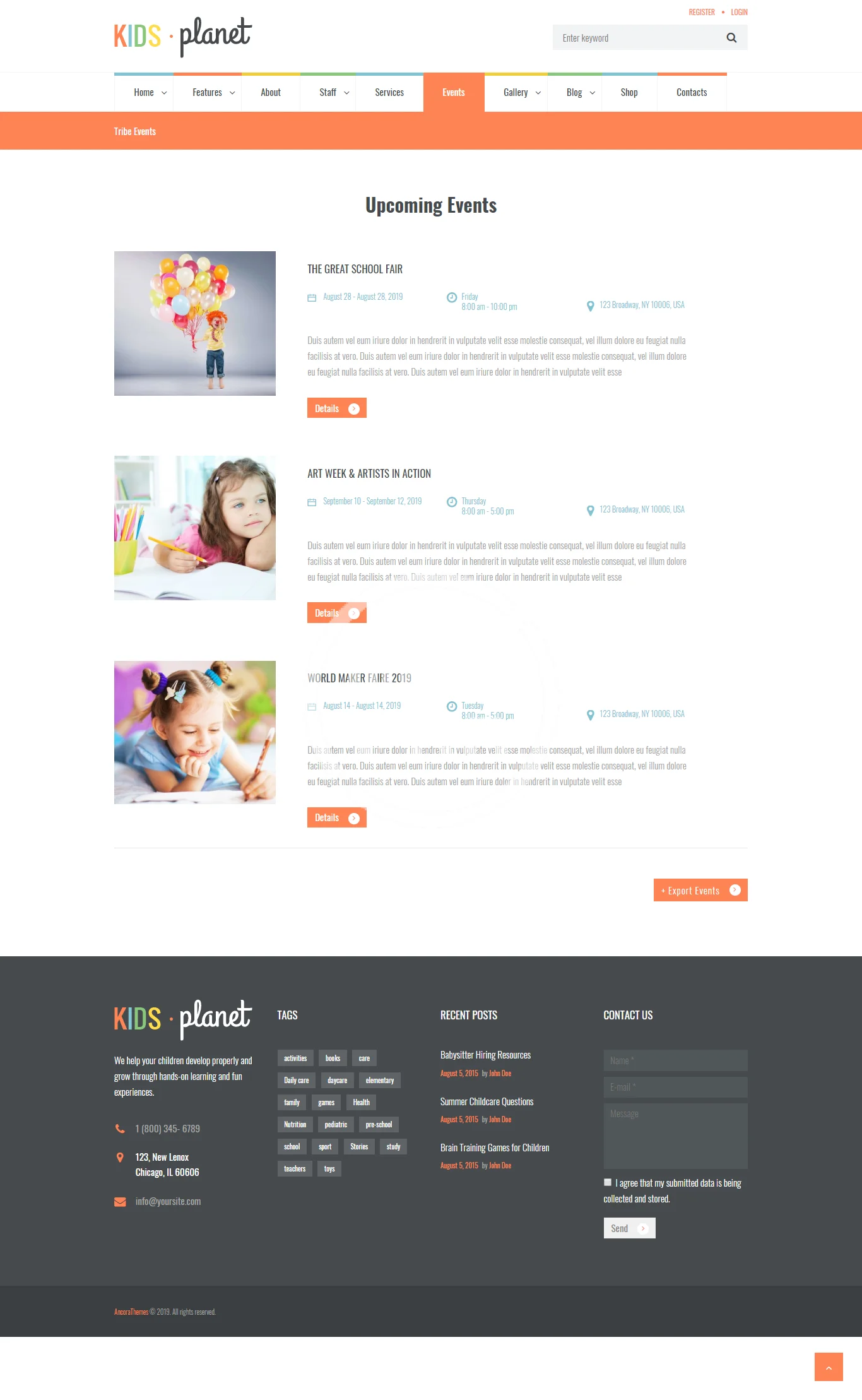Kids Planet ist ein spielerisches, farbenprächtiges und ansprechendes WordPress-Thema. Es ist für jede kinderbezogene Website geeignet: Kindertagesbetreuung, Kinderbetreuungsstätte, Vorschulbetrieb, Kindergarten, Kinderkunst- und Kunstschulen. Es passt auch zu Kindertagesbetreuungs- und Bildungsstätten, Grundschulen, Kinderklinik und sogar zu einem Kinderspielwarenladen.