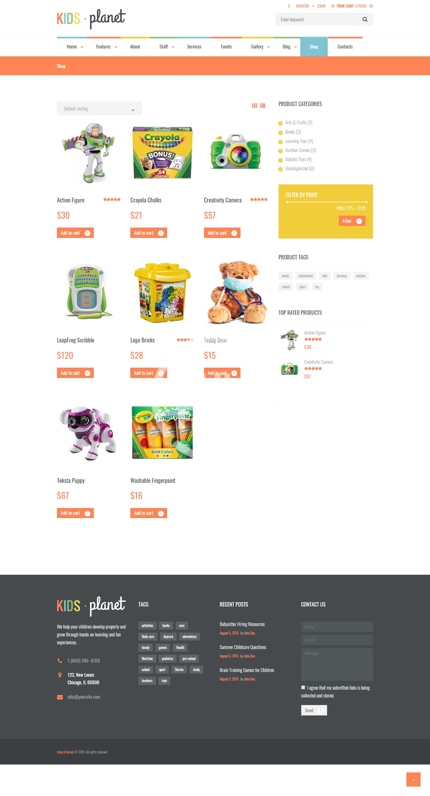 Dieses vielseitige Kinder-Thema enthält drei Startseitenlayouts mit Revolution Slider und einer zulässigen Bereich für die Präsentation Ihrer Fähigkeiten und Erfolge. Es wird begleitet von dem Plugin WPBakery Page Builder, das Kids Planet die Möglichkeit gibt, so viele neue Seitenlayouts wie Sie möchten zu erstellen. Die Kompatibilität mit WooCommerce, die hohe Flexibilität in der Personalisierung und andere Funktionen helfen Ihnen, das Thema zu genießen.