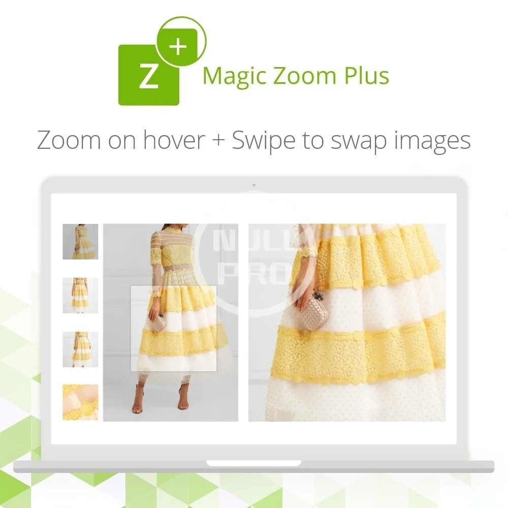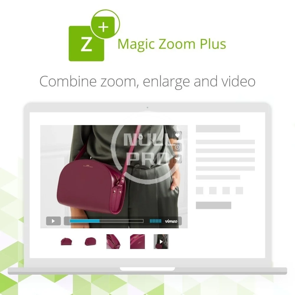 Magic Zoom Plus zooms AND enlarges images & includes product videos too. Hover to see a gorgeous zoomed image to the side; click to enlarge it and fill the screen. Switch between product images & product videos effortlessly.