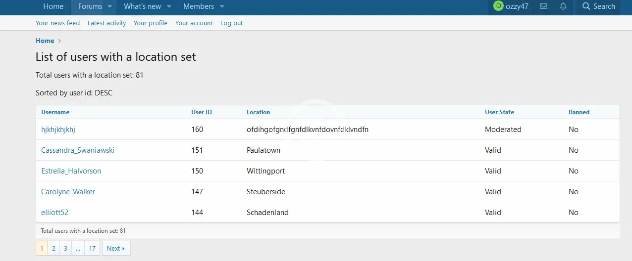This small addon will allow users with the correct permissions to view a list of users that have a location set in their profile. This can be useful to staff for monitoring spam like users.
