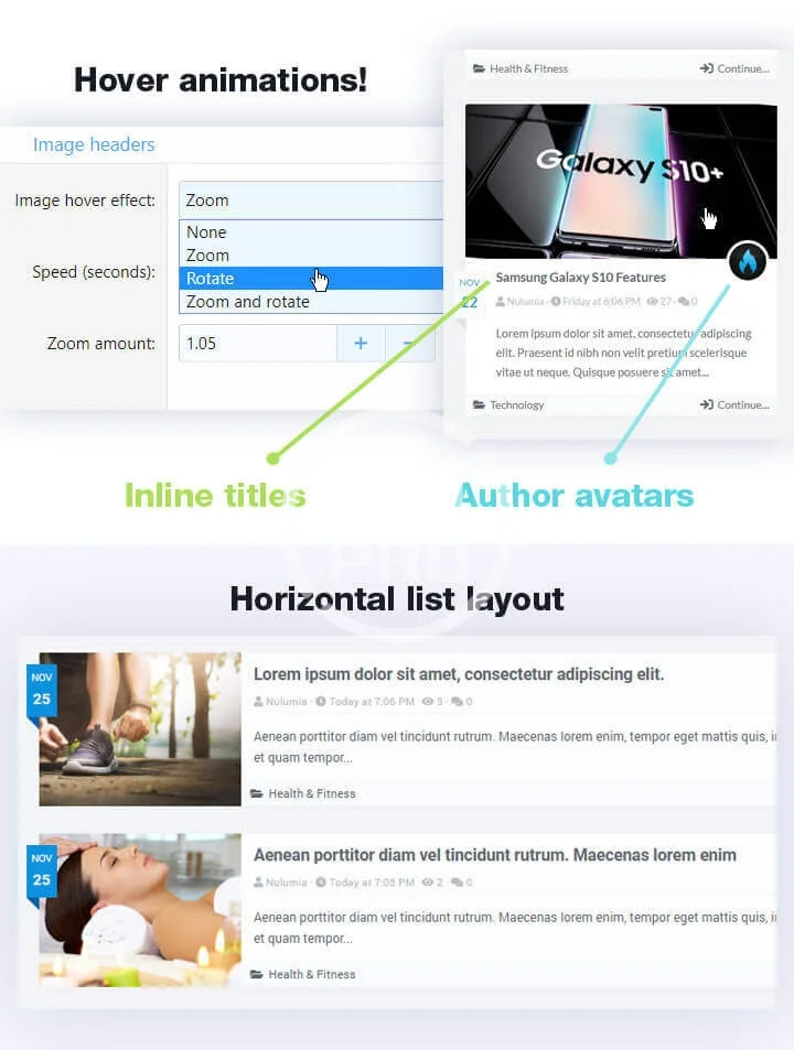 - Image hover effects (zoom, rotate, or both)!