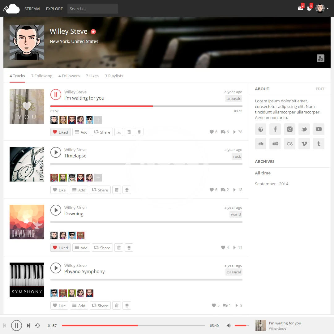 PROFILES – Rich user profiles with cover and avatar images, profile description, social network links, user tracks, following, followers, likes, playlists and more.