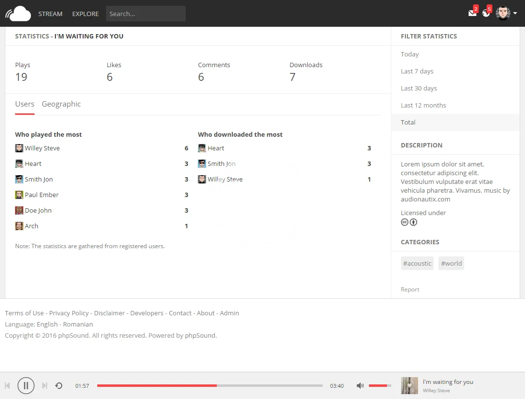 STATISTICS – Allow music creators to know their audience with advanced statistics such as Plays, Downloads, Likes, Comments, Most Played, Countries, Cities and more.