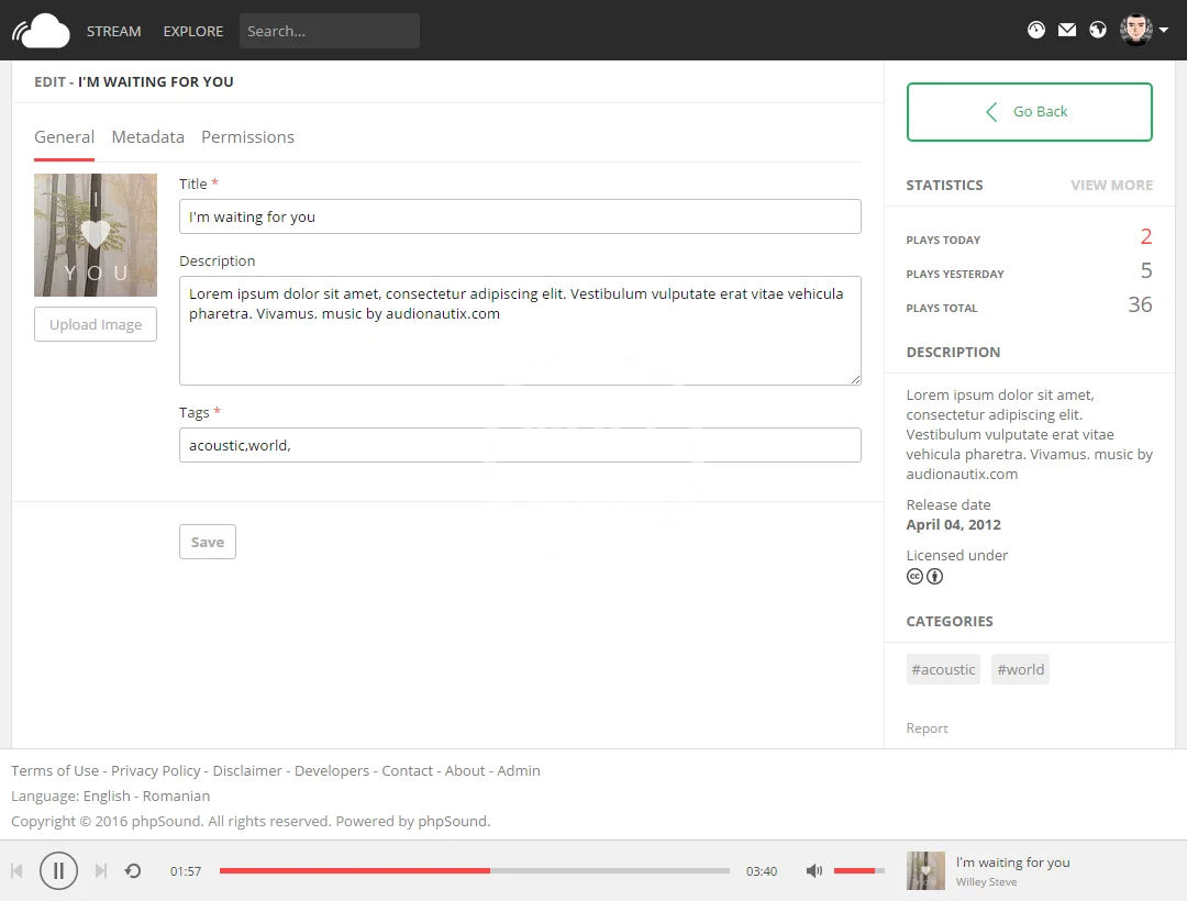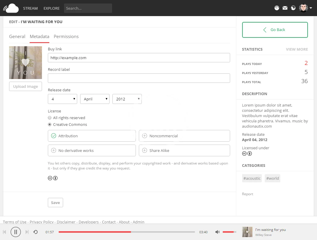 TRACKS – The tracks page displays information about the song such as description, statistics, license types, likes, publish date, categories and comments.