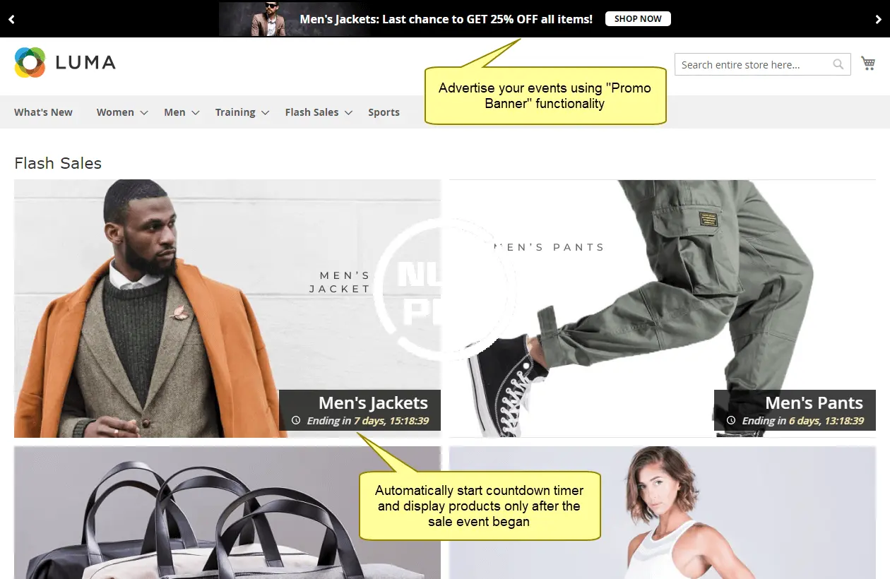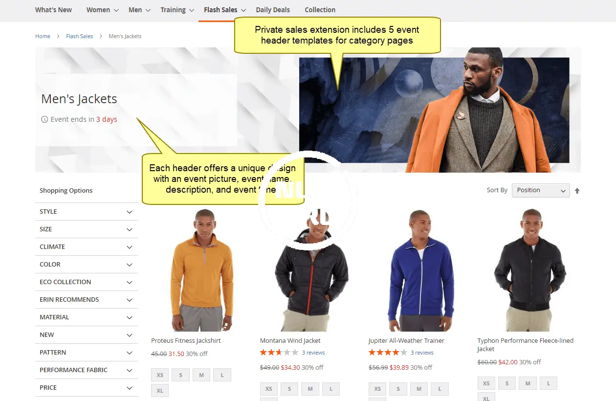 Plumrocket Magento 2 flash sale extension allows to create Private Sale, Flash Sales, Sample Sale, Daily deals and Limited time events with countdown timer on any existing or brand new Magento 2 store