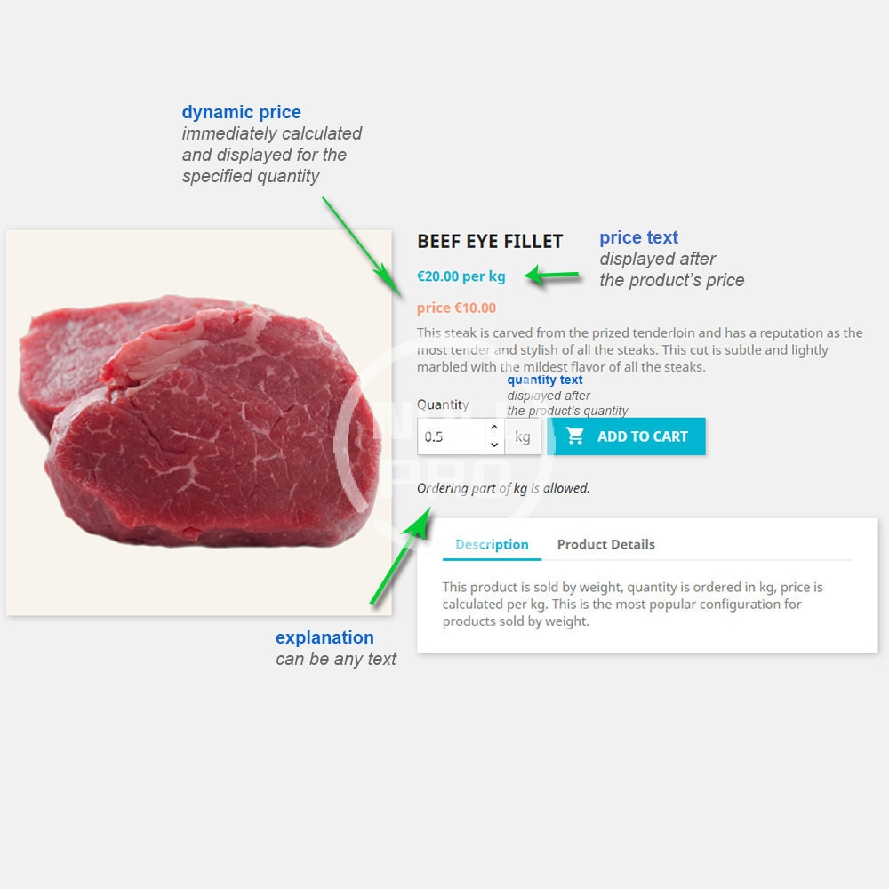 - Additional visual element - price for the specified quantity gives the user better shopping experience. The quantity price is immediately re-calculated when quantity changes.