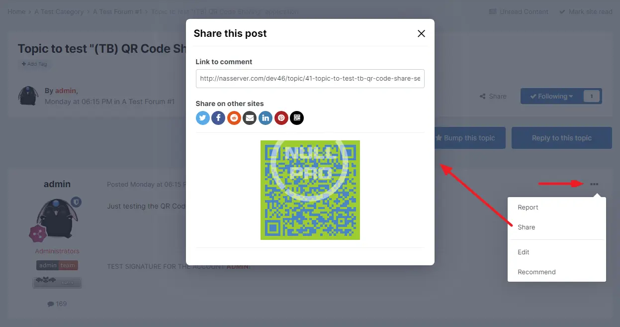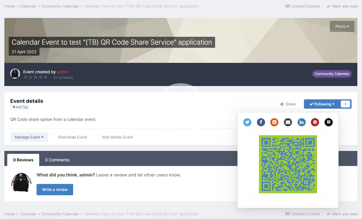 This application adds a QR Code to the share button for items and the individual share popup for individual posts/comments/reviews.