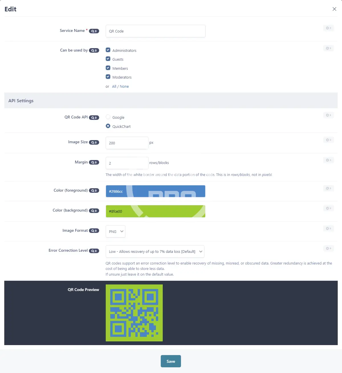 Options to change the following settings for all APIs: size, margin, error correction level.
