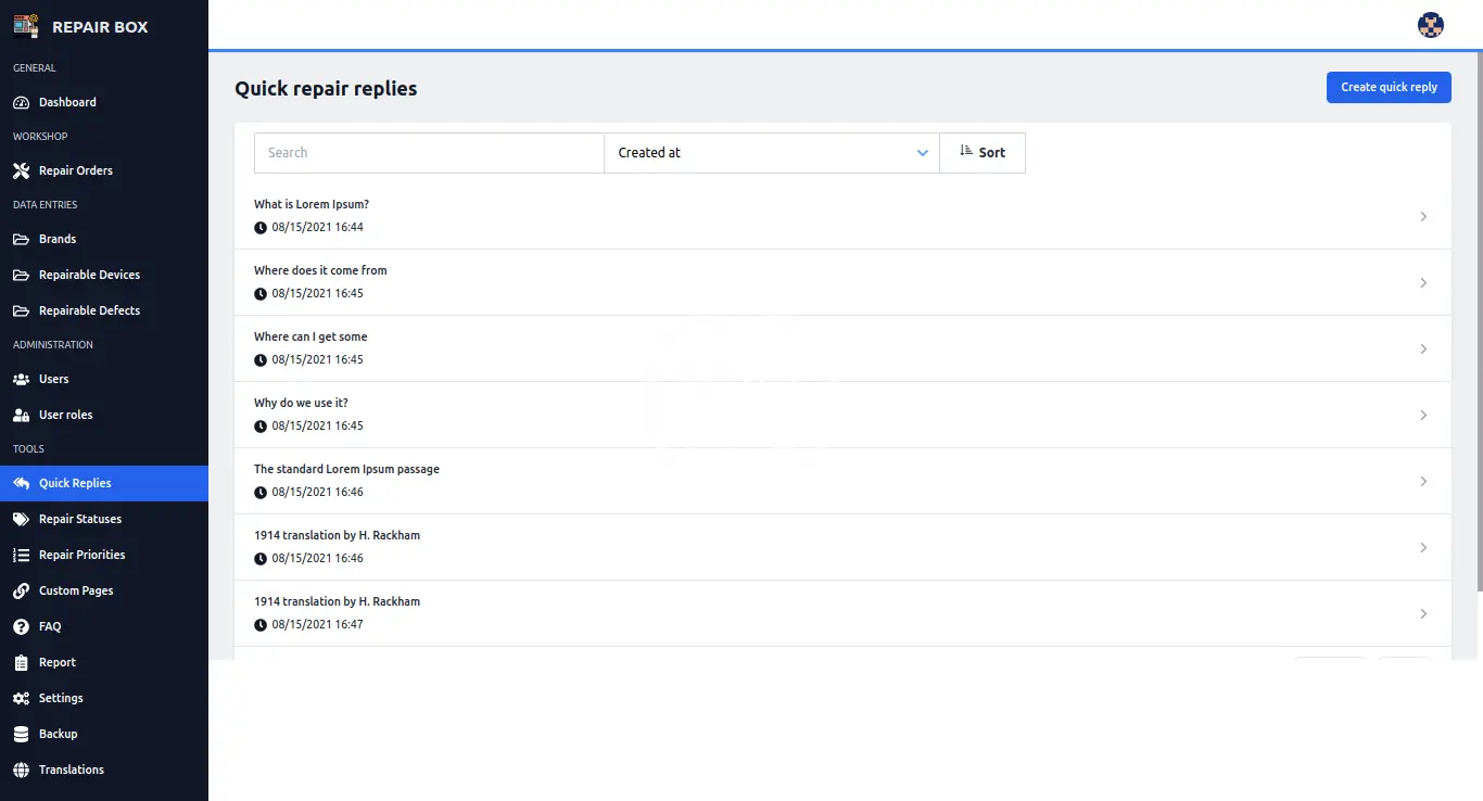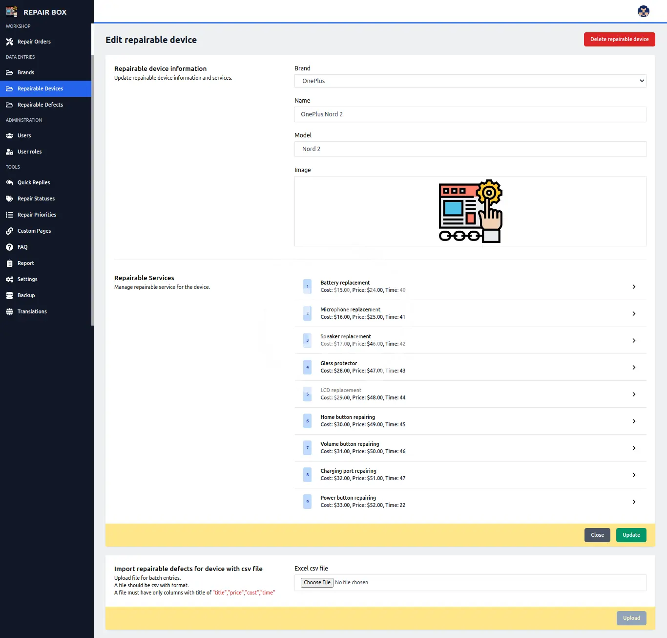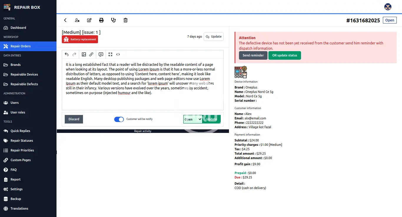 A repair box is a system for booking and managing repair services. Where can customers submit defective devices and the technician can take them to the workshop to repair and fix physical issues with the device. It is a very clean and simple interface, where every technician can go to the workshop to handle repair orders assigned to that particular technician. In the workshop, the technician can update the repair log with customer notification on each update while repairing.