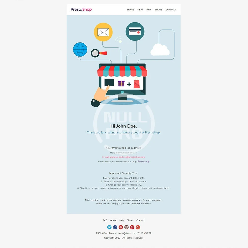 New: From 7/6/2020 we updated live editor and emails of modules (I'm sure our template is first template can support emails of module) if you use module BVP Email Templates Manager Pro (you can buy that module on Addon market and you should contact me to get discount code if you bought our email template). Current with this template we support all default module of prestashop as ps_emailalerts, ps_emailsubscription, followup... If you have 3rd module please contact me to check.