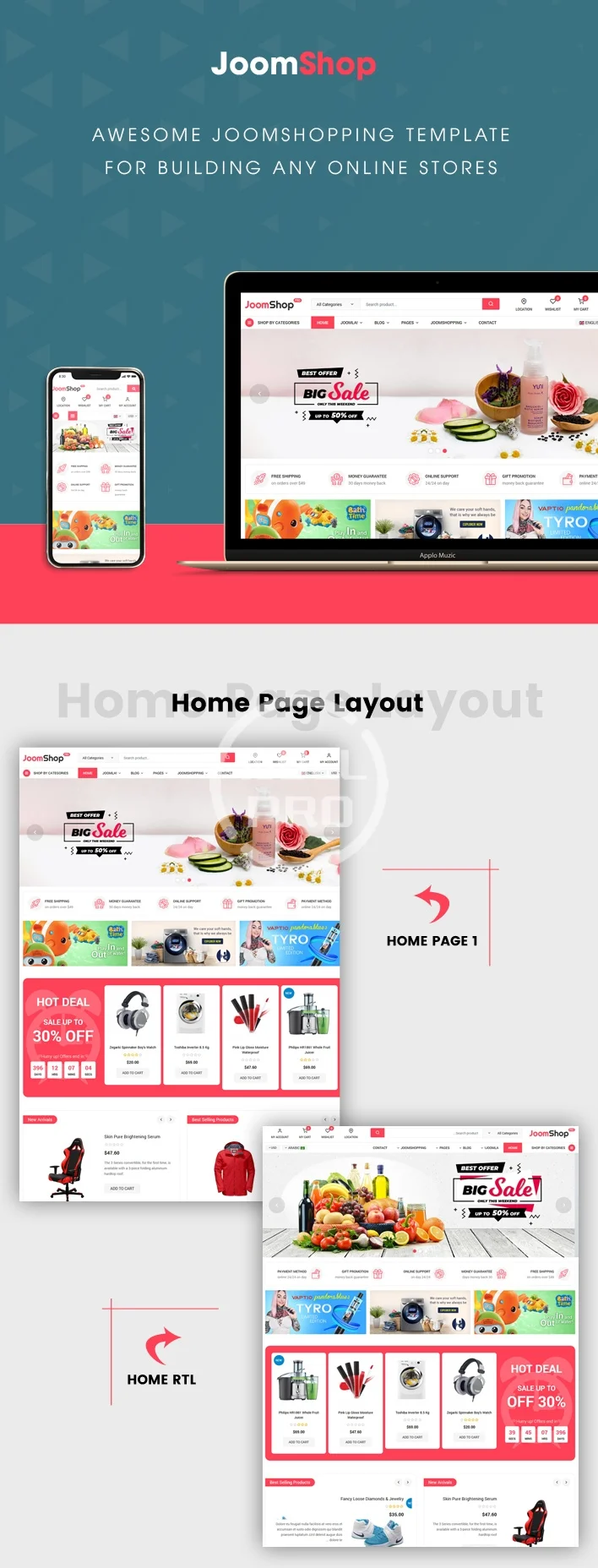 The Joomla 4 template - Sj JoomShop is built on Helix Framework integrated with dozens of high functionalities: Mega Menu, Drag & Drop Builder, Product quickview, RTL language, 65+ Useful ShortCodes built-in... This JoomShopping Joomla template can be used for an online store with a huge number of products. You can easily manage the store and make it impressing among others. Besides, we also provide the Quickstart package that you can quickly install your website as same as our demo.
