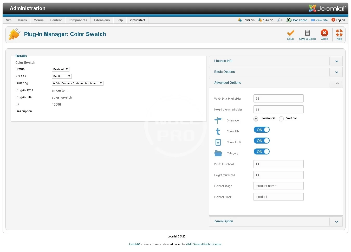 Virtuemart Color Swatch not only simply show color, but also integrated with jQuery and Ajax technology that allow price being attached with particular colors. Also, using the color swatch, the zoom plug-in can be included without any extra fee; product image is viewed clearer under different corners.