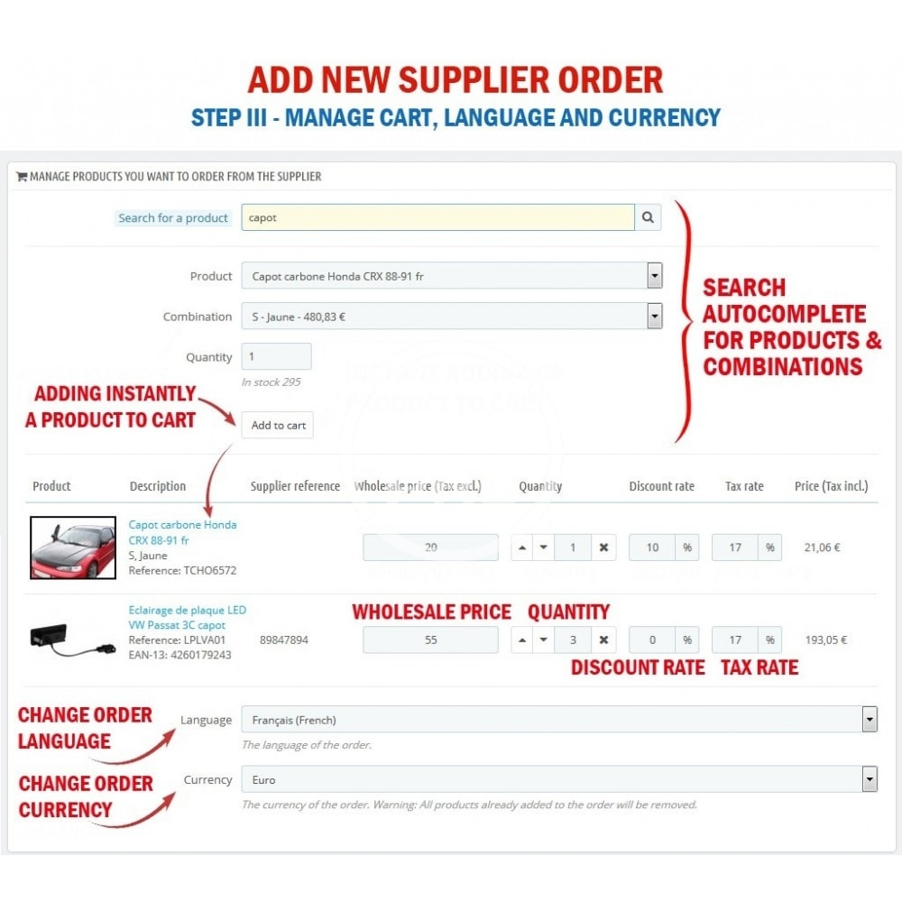 • Create / Edit supplier order. Different ways are available to add products on fly in cart: