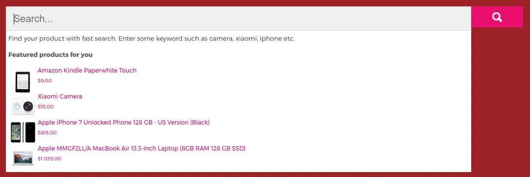 - Main Feature: Very fast search suggestions by Product name, description, category, tag, meta fields, attributes and SKU – no loading time, no waiting, no any ajax or server-side loading, so it is really fast.